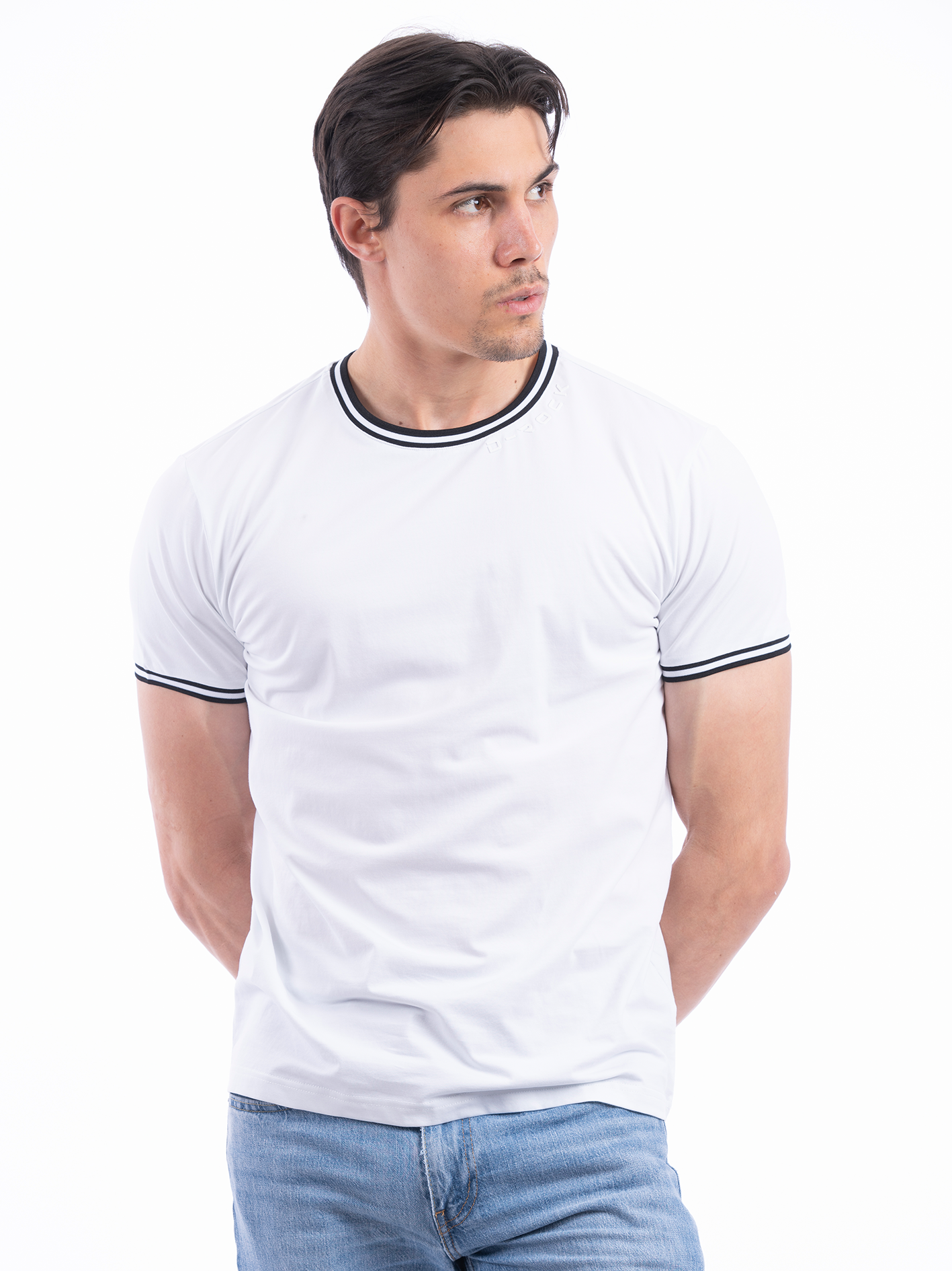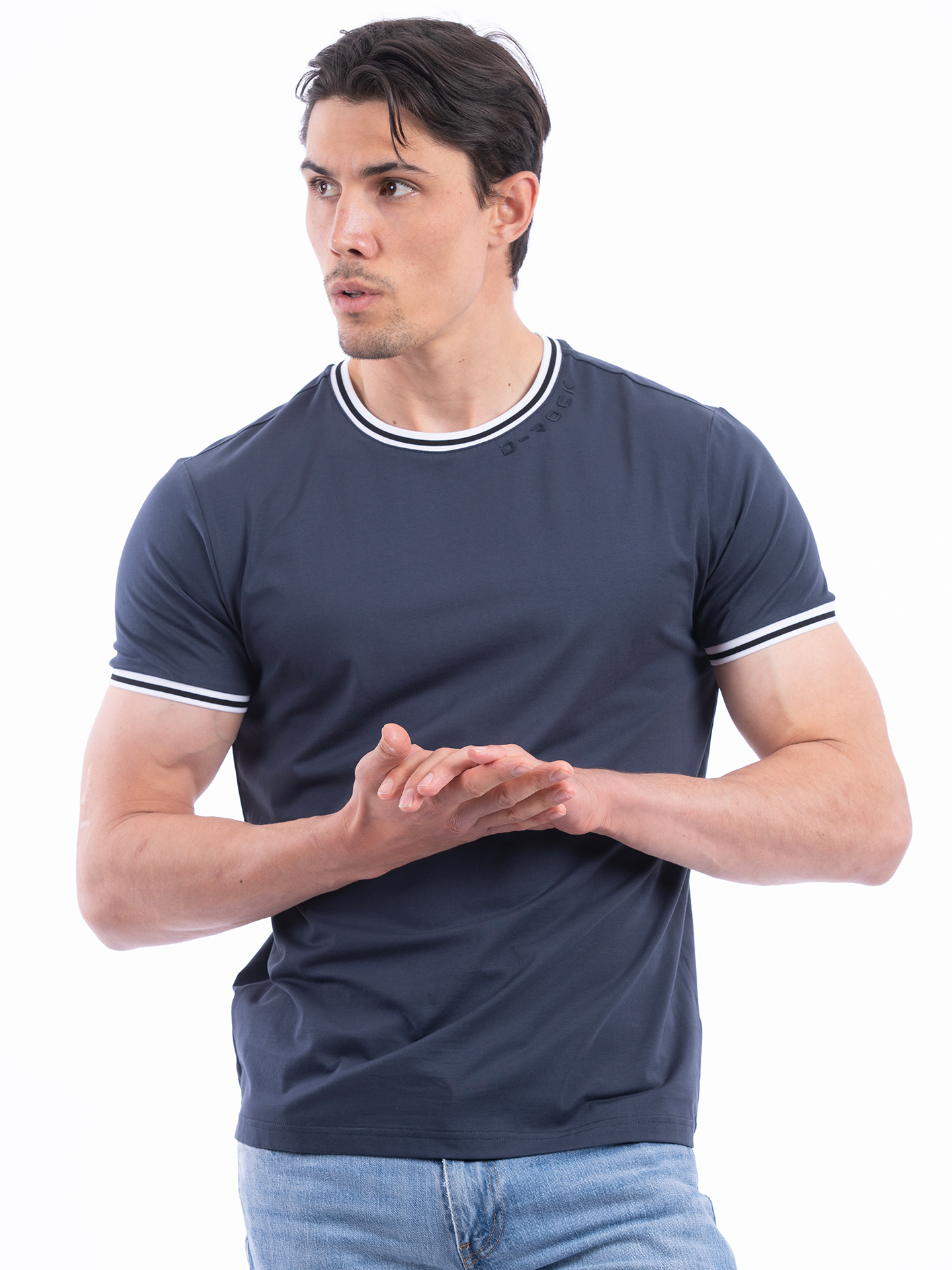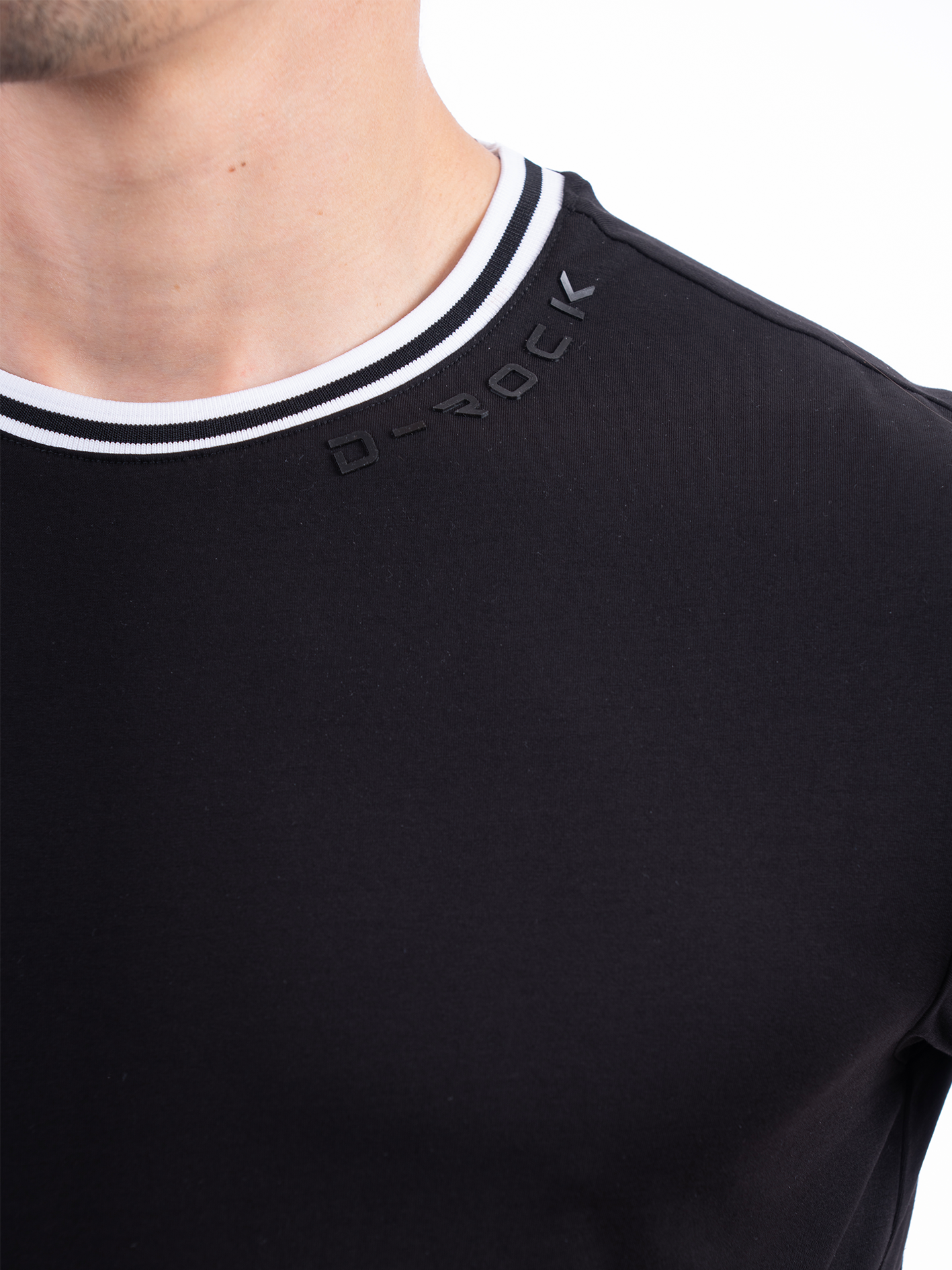 Men’s T-shirt made from soft Lycra jersey with added stretch for comfort. Features contrast stripe detailing on the collar and cuffs, with a dye-to-match ‘D-ROCK’ logo wrapped around the collar.