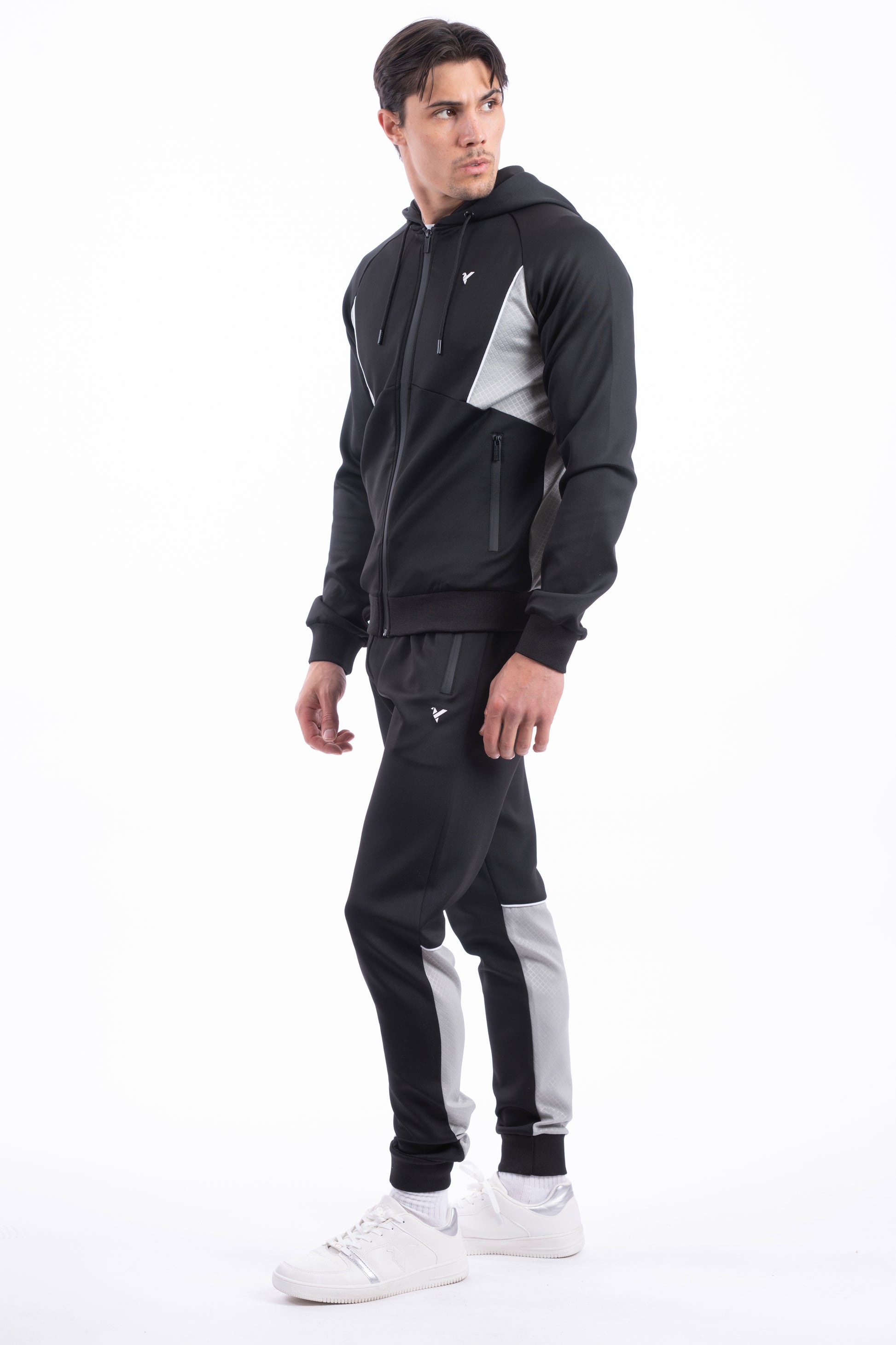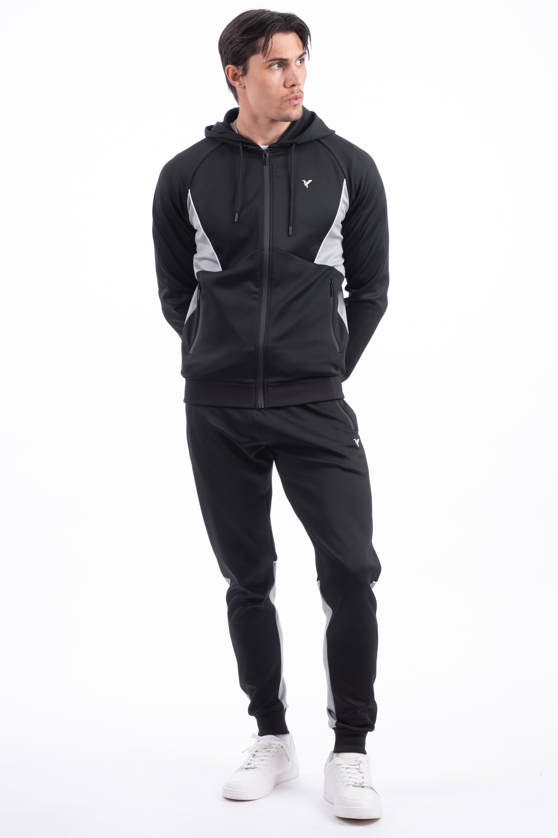 Kid's tracksuit featuring cut and sew panels down the side chest with contrast piping along the seam. High density logo on chest. Contrast zips and trims.