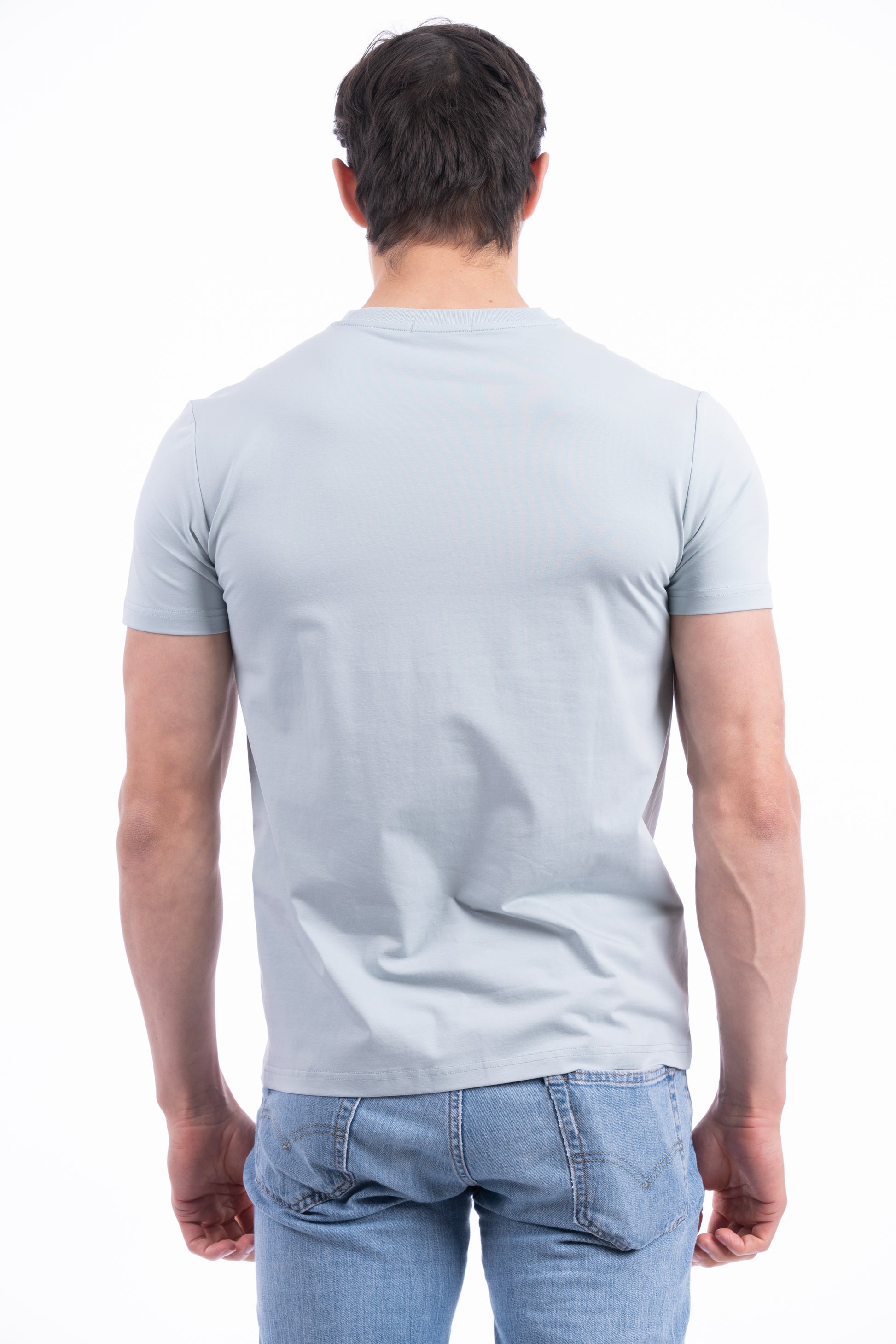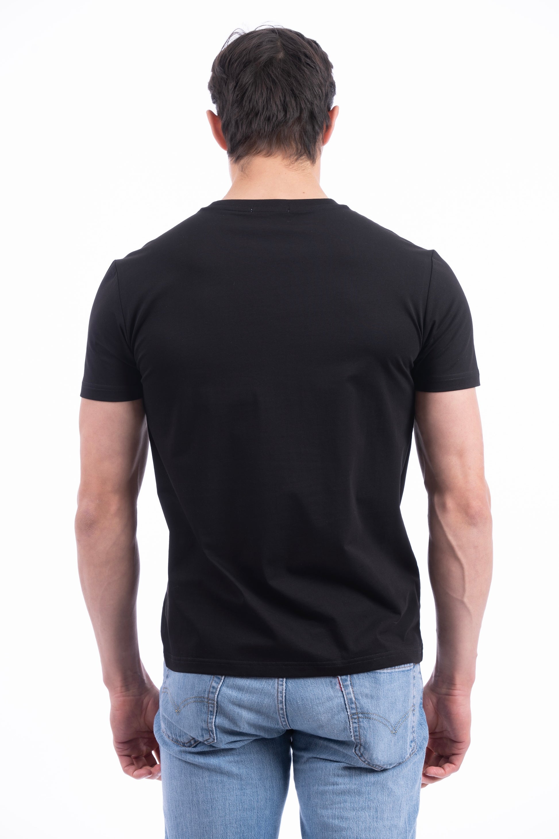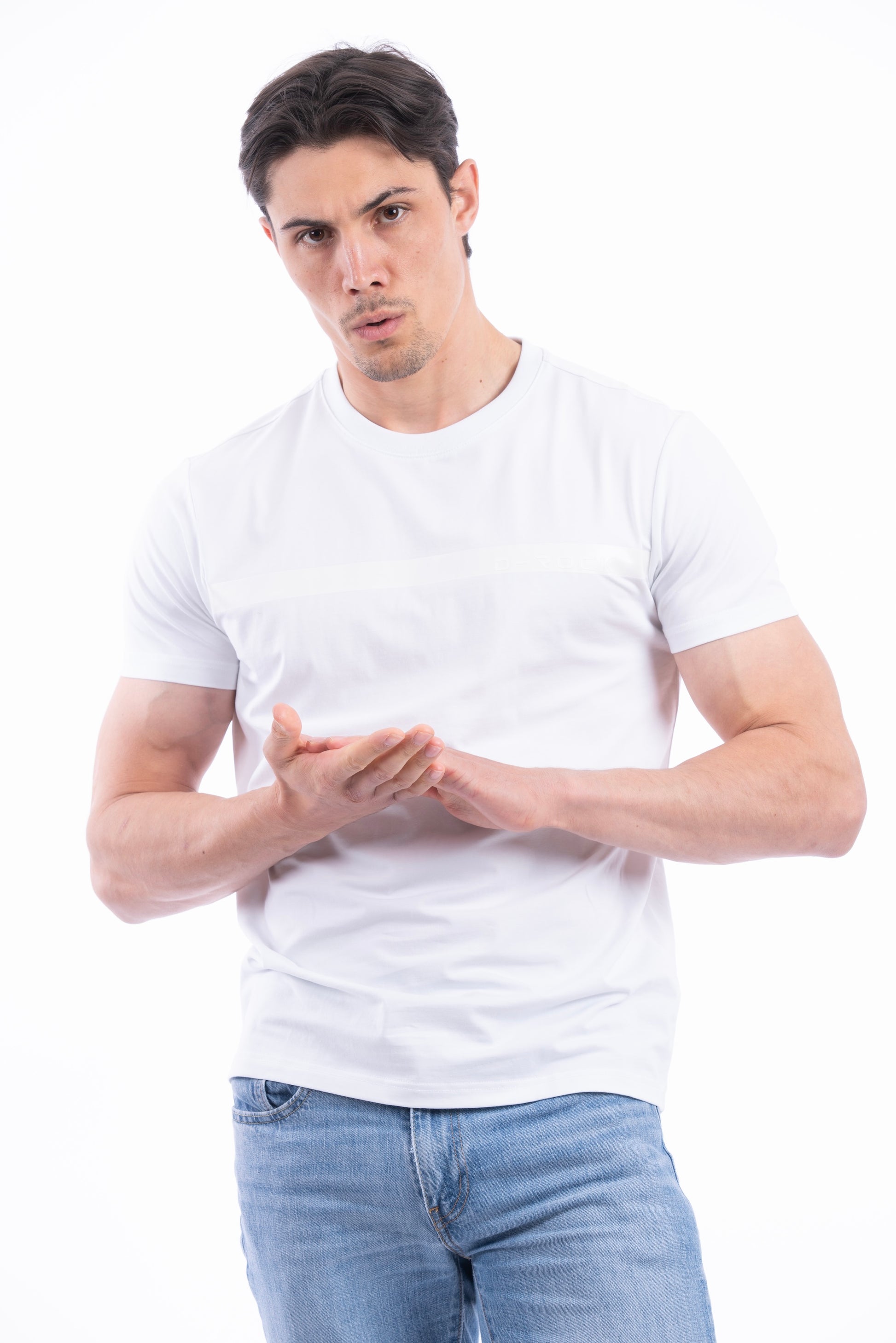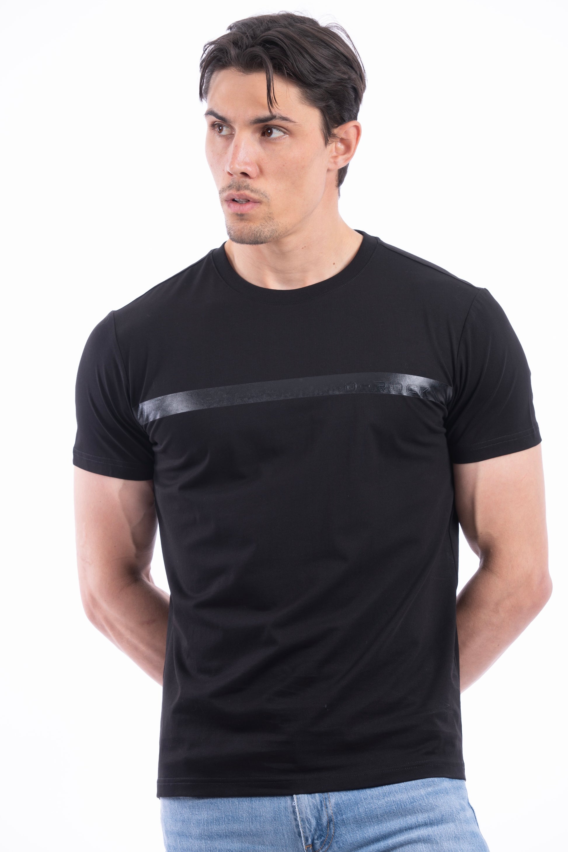 Men’s T-shirt featuring a decorative tape strip across the chest with ‘D-ROCK’ embossed on the left side of the tape.
